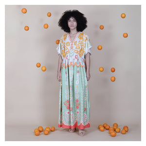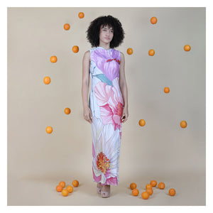 The ROSITA DRESS captures modern femininity in an abstract floral georgette lurex fabric. Its high tie-up neckline and ruffled detailing create charm, the long sleeves bring the look together. Lined with viscose jersey for comfort, this maxi dress is designed for those who love style with a touch of shimmer.