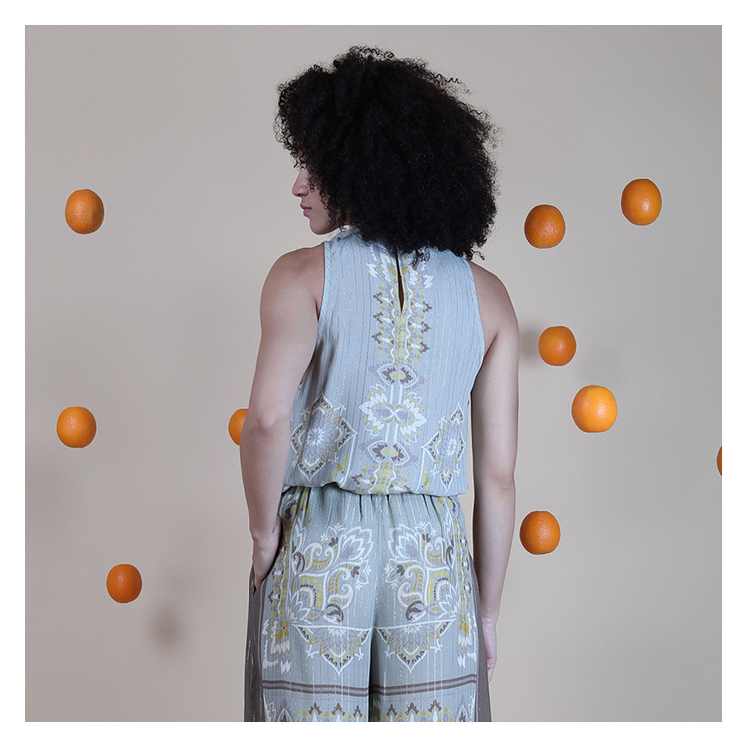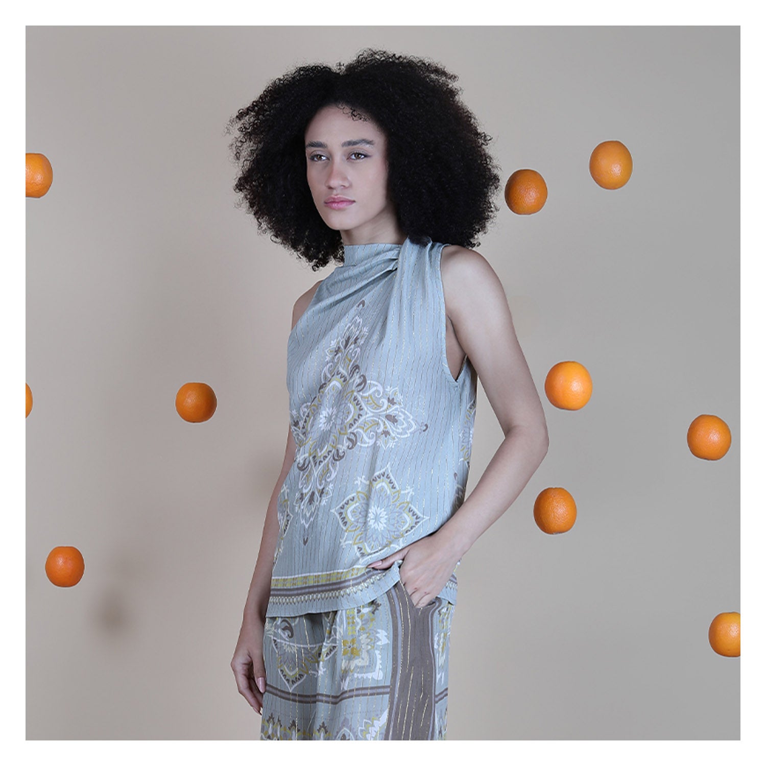 The SHARLEE TOP is crafted in 90% viscose and 10% lurex, giving the fabric a soft drape with a subtle shimmer that elevates the overall look. The design features a softly draped high neckline that creates an elegant silhouette, enhanced with delicate printed motifs across the front. The lightweight structure allows the top to fall beautifully over the body. At the back, a refined keyhole opening adds a subtle yet graceful finishing detail.