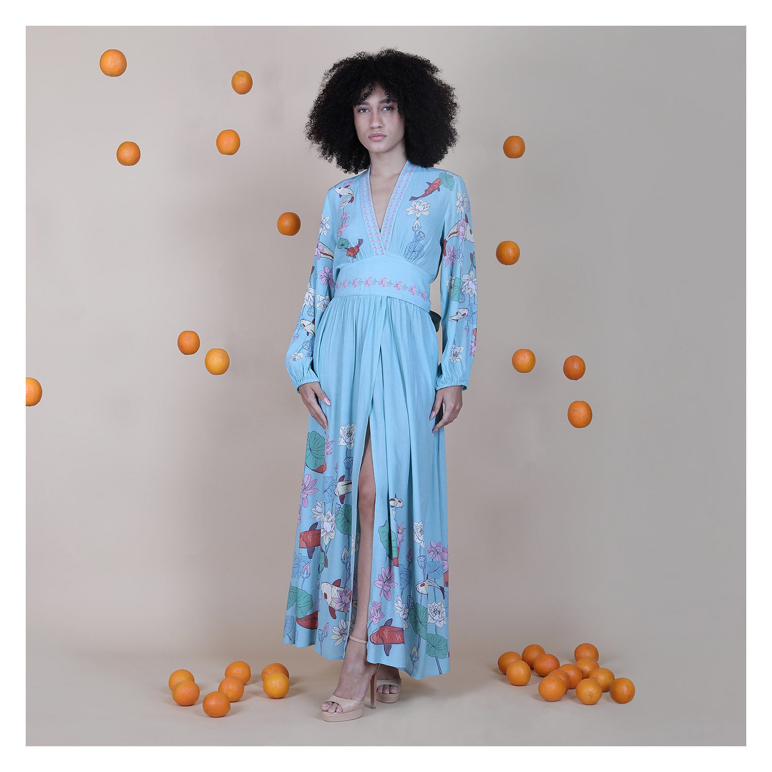 The Ileen Dress has a soft, flowing shape that moves easily with the body and feels light to wear. The sky-blue base with floral and koi-inspired print gives her a fresh, artistic look that feels playful yet elegant. Contrast detailing at the neckline and waist adds gentle structure while keeping her feminine softness. Crafted from 100% viscose, the fabric drapes beautifully and remains light and breathable, perfect for resort trips and summer outings.