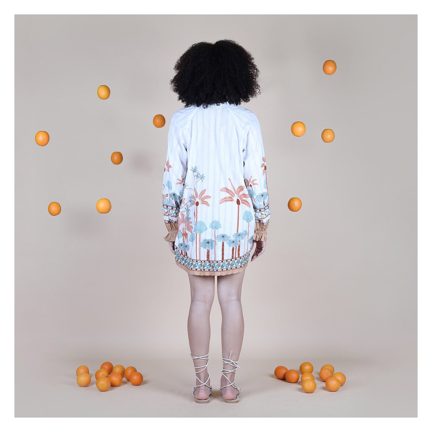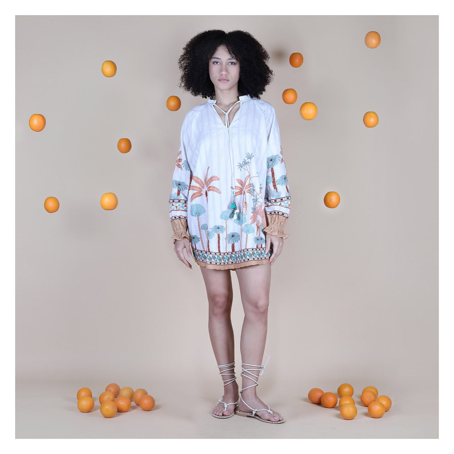 The KELVI TUNIC has a relaxed, easy silhouette designed to sit loose on the female body while still looking polished. The upper body features a soft split neckline with tie detail and gentle gathers that create a light, airy fall from the shoulders. The engineered palm and botanical print runs cleanly along the hem and sleeves, giving the piece structure without overpowering the look. 100% cotton fabric feels breathable, soft on skin, and holds a natural drape that doesn’t cling. It moves freely when you walk and keeps a fresh shape. Perfect for beach days, resort lounging, vacations, and warm-weather city wear.