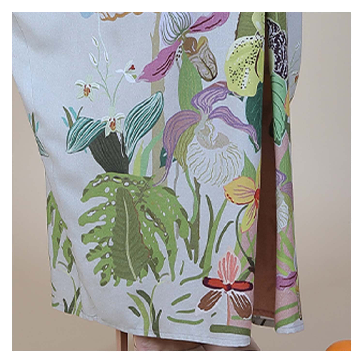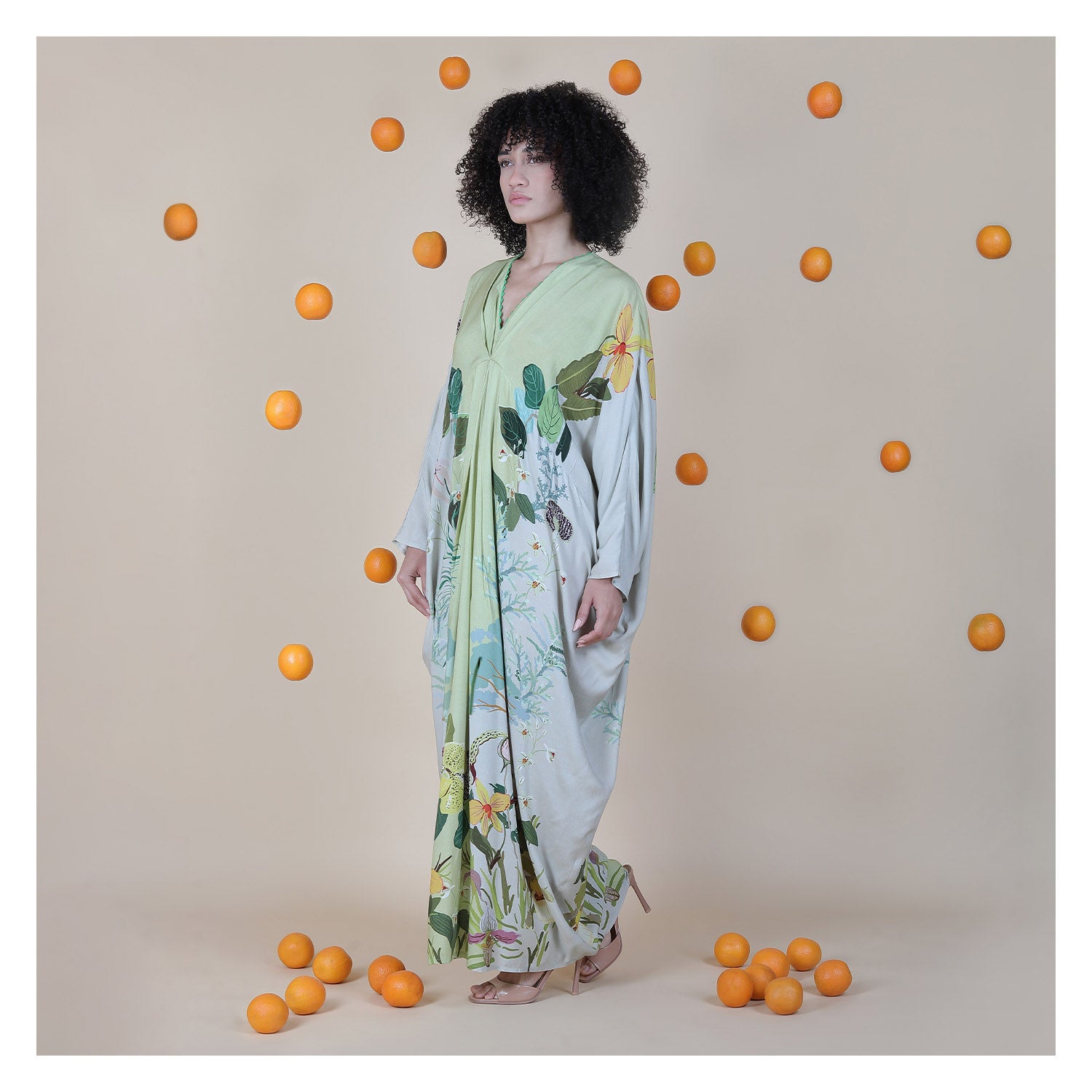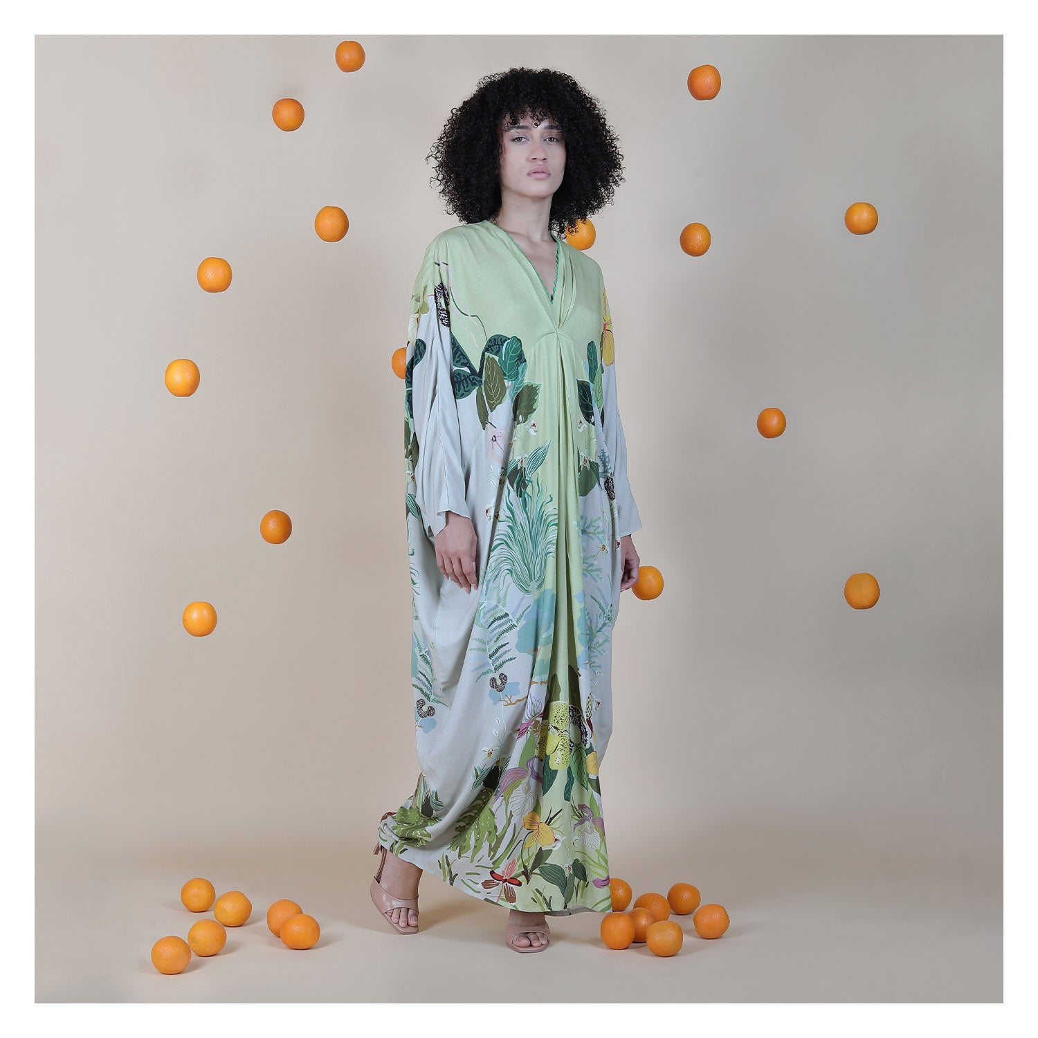 The Armenia Kaftan has a relaxed full-length drape that flows softly and gives her effortless elegance. The botanical print adds an artistic garden feel while the deep neckline and wide sleeves keep her airy and modern. She moves beautifully with every step, creating a fluid silhouette. Crafted from 100% viscose, the fabric stays light and breathable, making her perfect for holidays, beach escapes, and relaxed resort lounging.