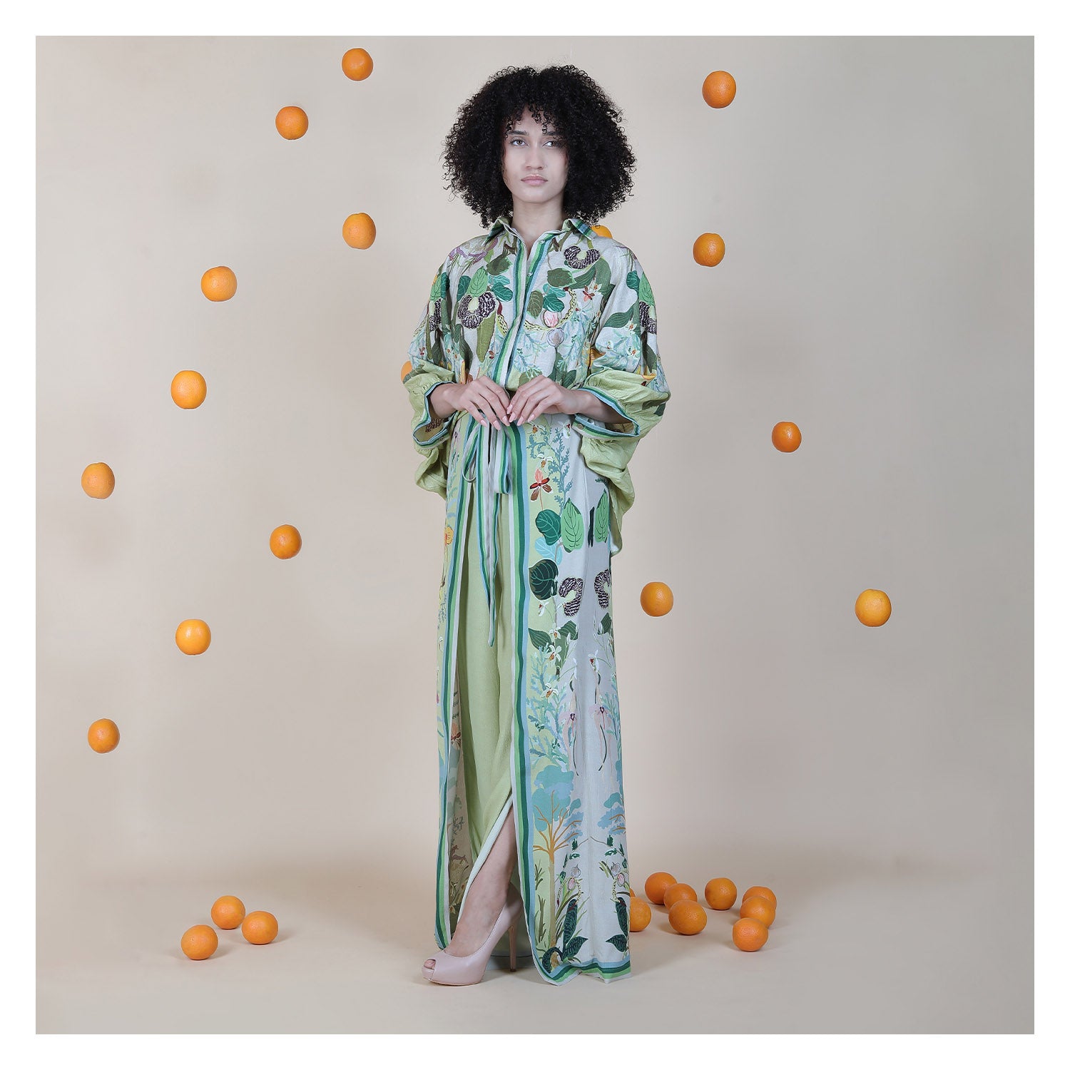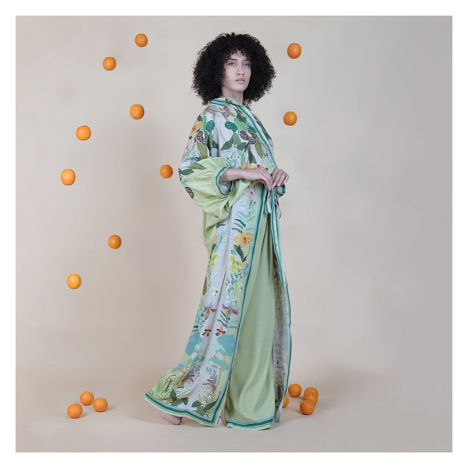 Piece is made from 100% Viscose fabric. We recommend dry cleaning only due to the fabric's delicate nature. Following these recommendations will ensure you can enjoy this design for many years.