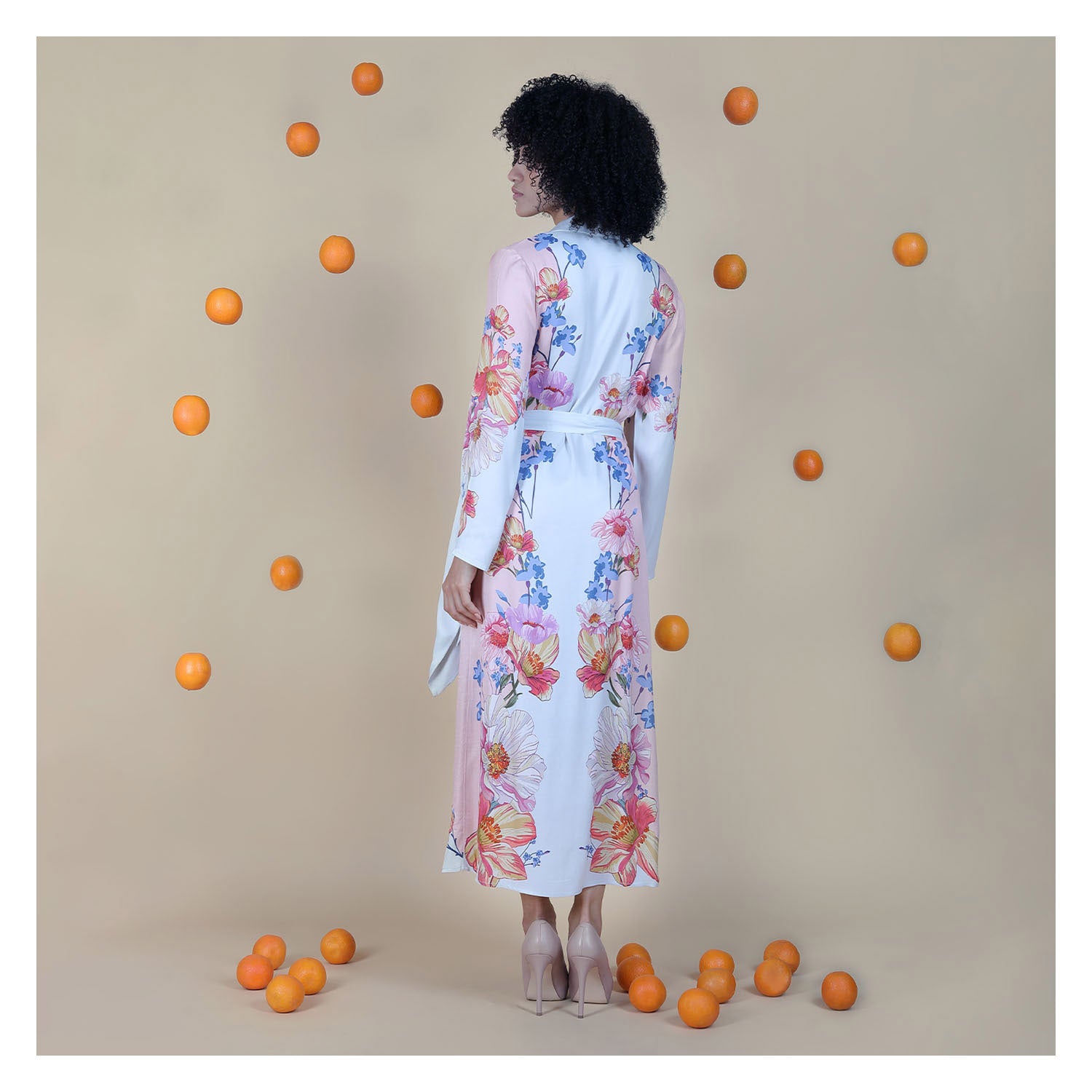 The Felice Wrap Dress has a clean, feminine silhouette that falls softly and flatters the body with an easy, fluid shape. The pastel floral print creates a bright, fresh statement while keeping her elegant and modern. Long sleeves and the tie waist add gentle structure and definition. She moves comfortably with every step. Crafted from 100% viscose, the fabric remains light and breathable, perfect for brunches, holidays, and warm daytime events.