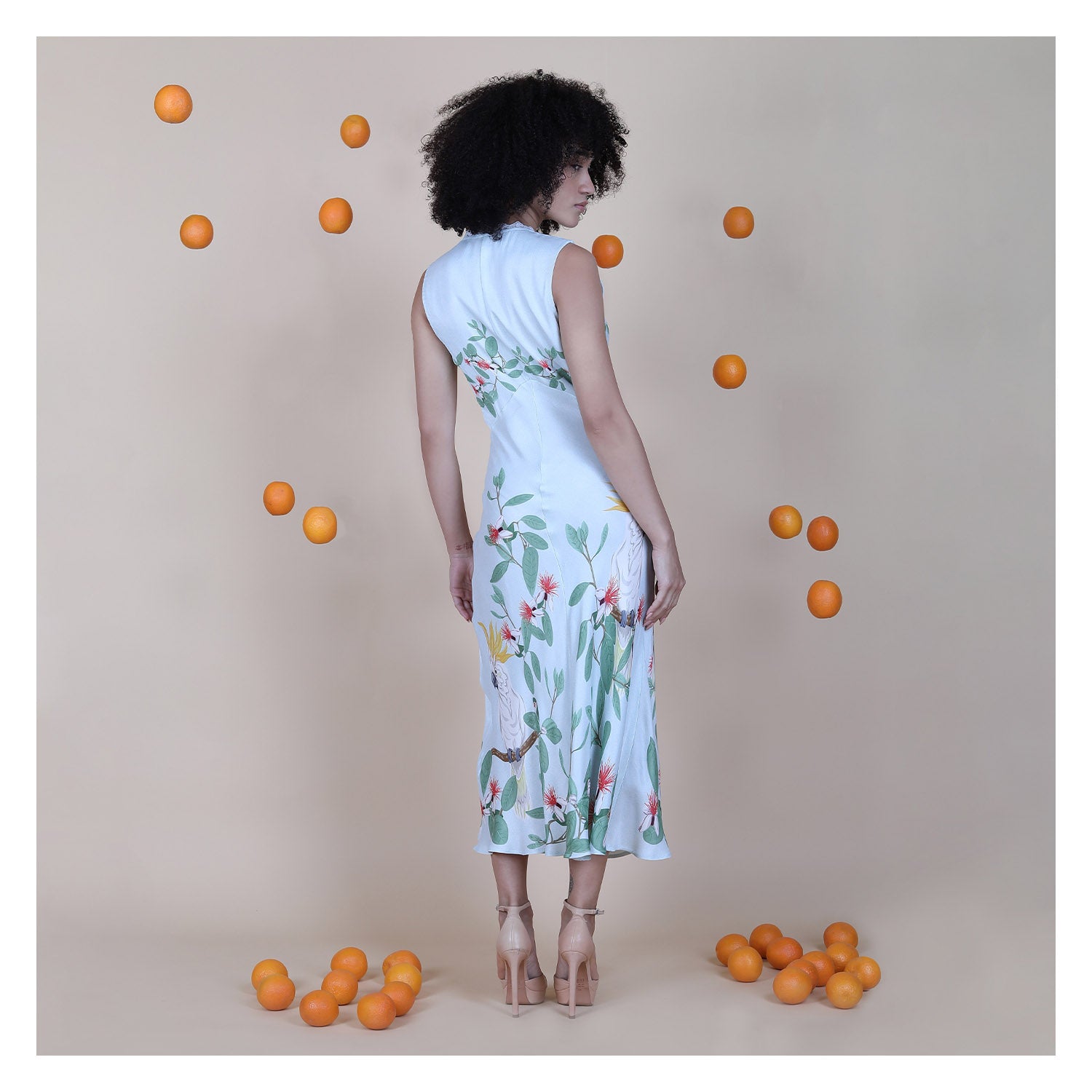 The PATRISHA DRESS has a clean, sleeveless silhouette that sits close to the body and falls into a soft, fluid hem. The engineered botanical print on a fresh sky base creates a calm, refined statement without feeling loud. A deep V neckline with delicate trim adds subtle detail while keeping the look elegant. When worn, the dress skims the body smoothly and moves with a natural, graceful flow. The 100% viscose fabric feels light, breathable, and soft against the skin, giving a flattering body fall. Perfect for brunches, summer evenings, vacations, and daytime events.