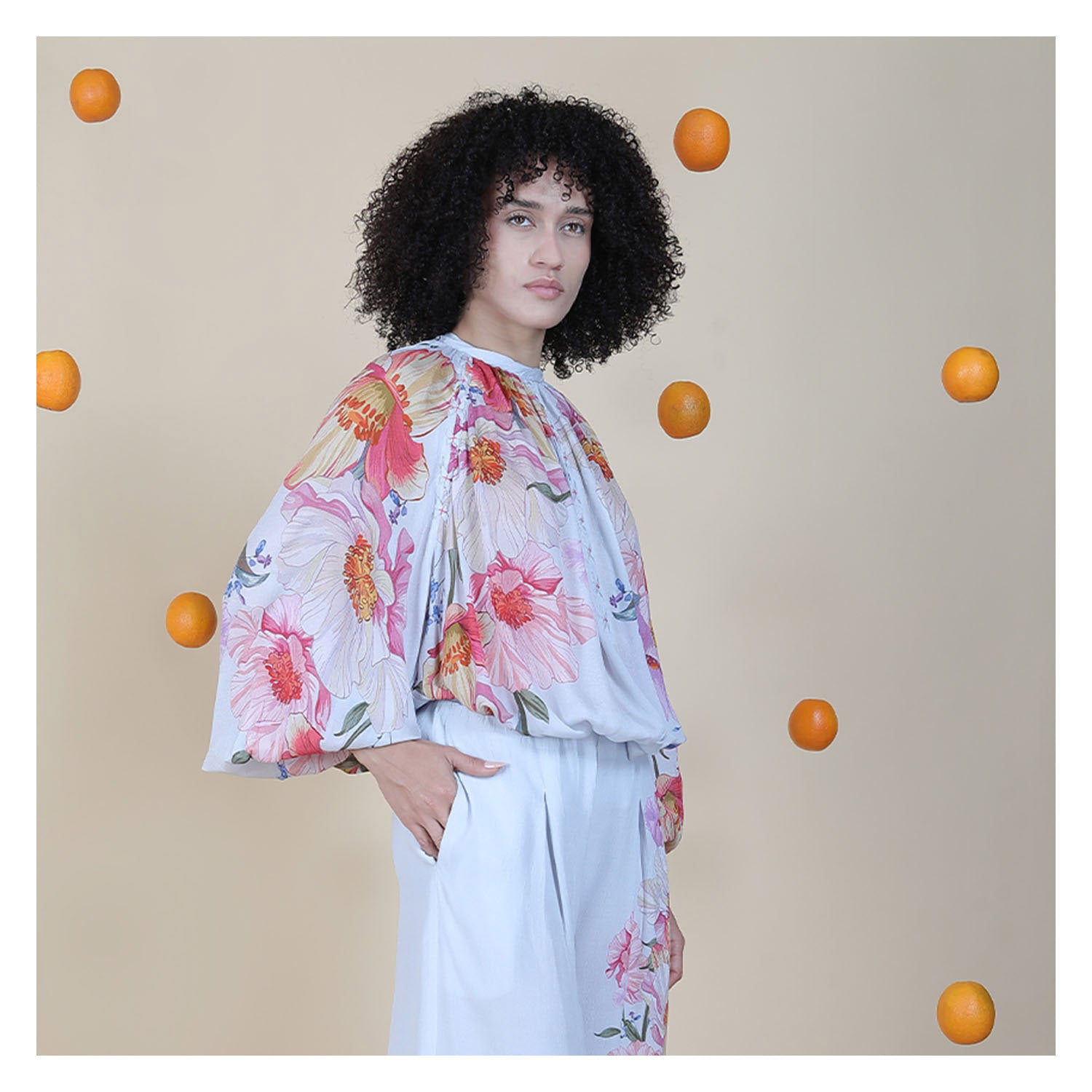 The Eleyna Top features a soft, gathered neckline that creates a relaxed drape across the upper body, giving volume without looking bulky. The engineered oversized floral print blends layered petals in pink, coral, and lilac tones over a calm base, creating a statement that feels artistic but wearable. Sleeves fall loose with gentle gathers at the cuff, adding movement and shape. 100% viscose fabric feels smooth and fluid on the body, skimming without sticking and keeping a light, airy fall. It works best for brunches, vacations, summer evenings, and polished daytime dressing.
