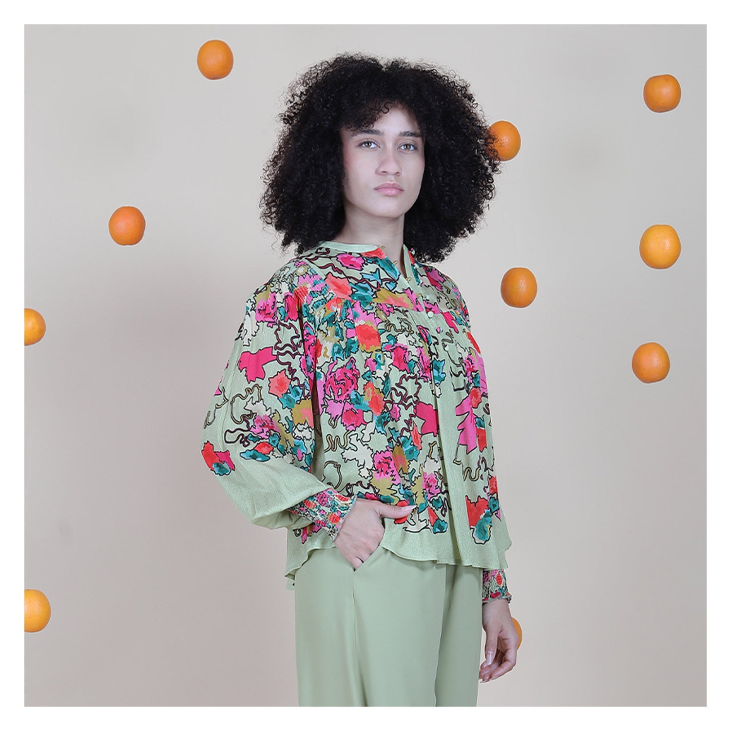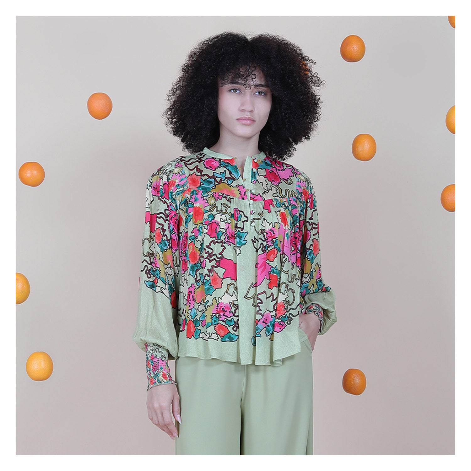 The Findel Top has a relaxed, airy silhouette that drapes softly over the body and moves with natural flow. A bold abstract floral print in vivid pink and coral stands out against the sage base, giving it an instant statement look. The split neckline with gentle gathers adds soft volume, while balloon sleeves with smocked cuffs balance the shape. Lightweight 100% viscose feels smooth and breathable, falling cleanly without clinging so the top keeps its fluid movement. Ideal for brunch, vacations, and relaxed day outings.