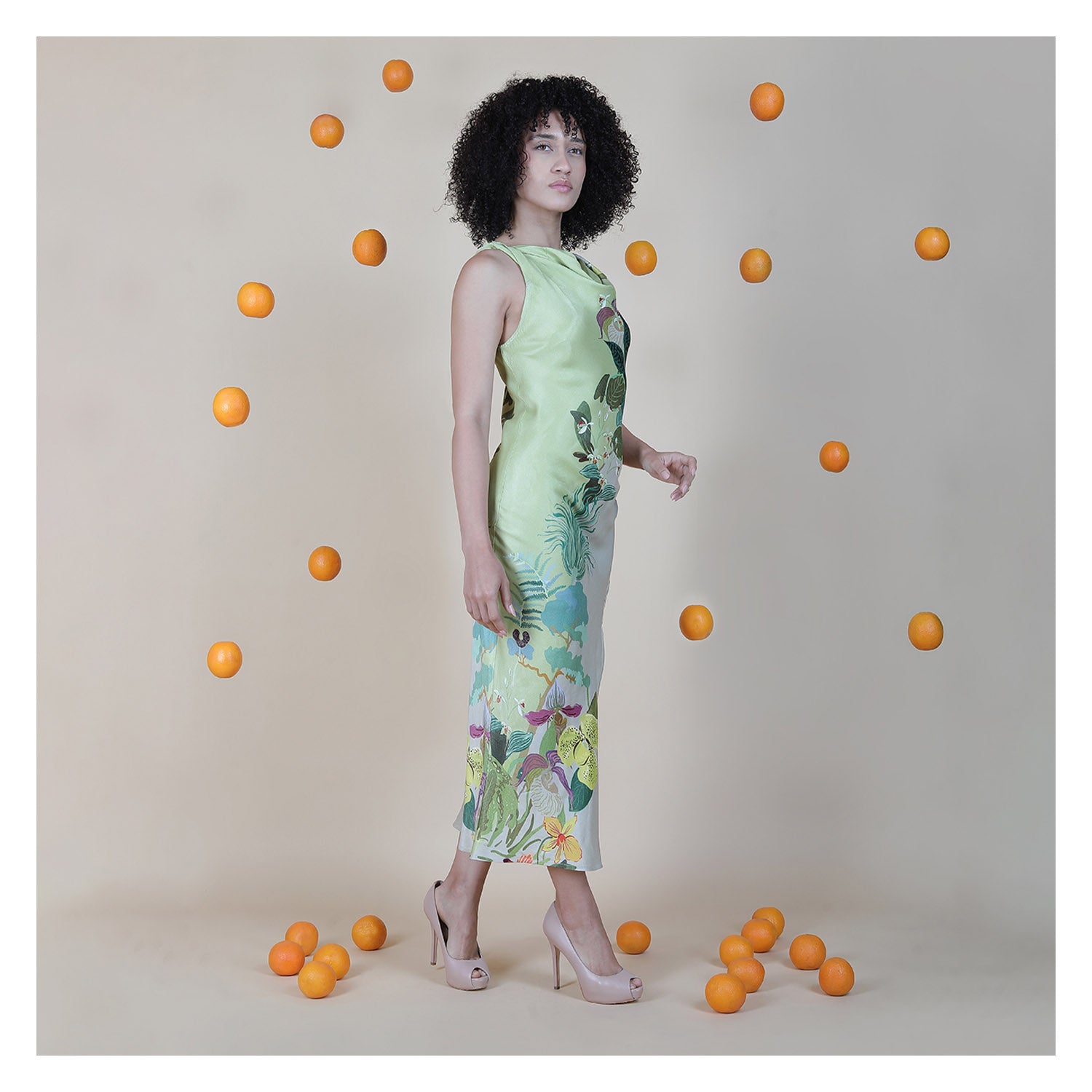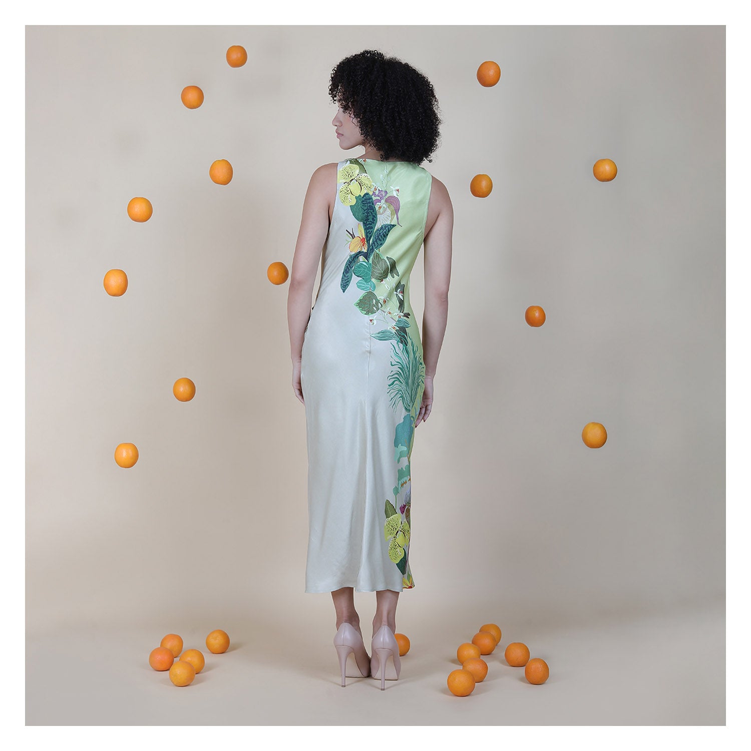 The Peggy Dress has a sleek, fluid shape that gently skims the body and gives her an elegant finish. The soft ombré fade and vertical botanical print create an artistic look that feels clean and modern. A sleeveless cut and subtle slit keep her minimal yet graceful. Crafted from 100% viscose, the fabric stays light and breathable, making her perfect for summer events, garden parties, and relaxed resort evenings
